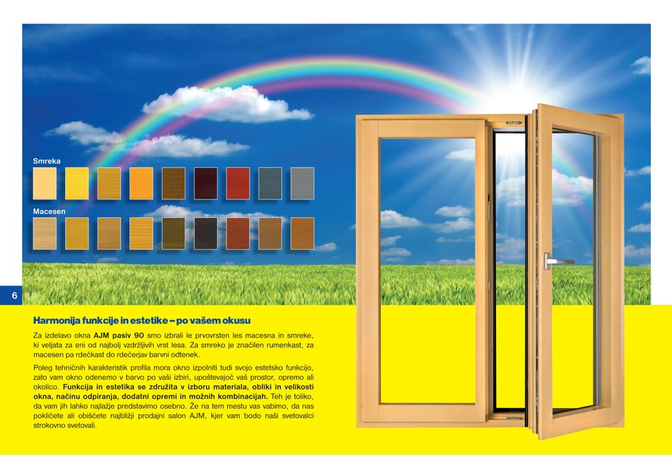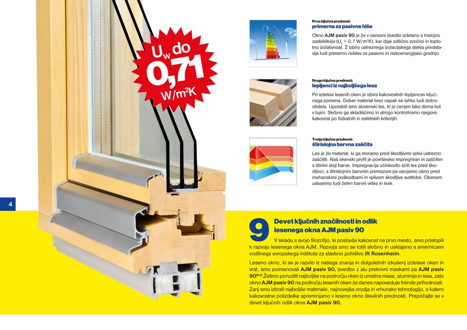 Leseno okno AJM pasiv 90 ima v osnovni izvedbi že tri slojno za¬steklitvijo (Ug = 0,7 W/m2K), tako, da je odlični zvočni in toplotni izolator. Tako da je primerna rešitev za pasivno in nizkoenergijsko gradnjo.