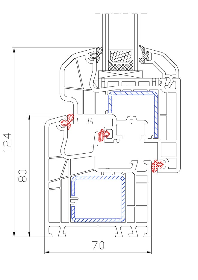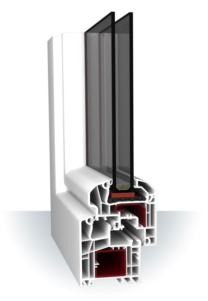 To izjemno PVC okno Ima poleg trojne zaščite, širok, elegantno oblikovan profil , zaokroženih linij. Tri brezkončna tesnila in velik naslon podboja na krilo. Poleg tega je to PVC okno visok zvočni in toplotni izolator.