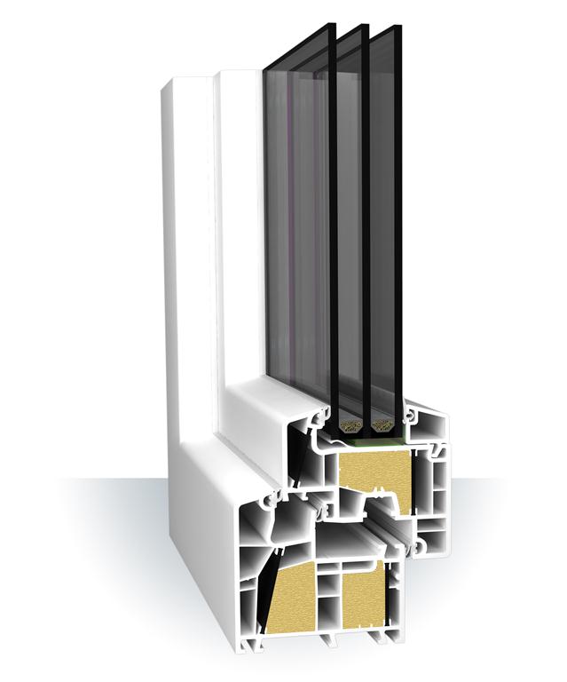 Je PVC okno, ki ga odraža masivnejša in zaobljena oblika.Ima jekleno ojačitvijo v podboju in krilu ter je izdelano za graditelje nizkoenergijskih objektov.